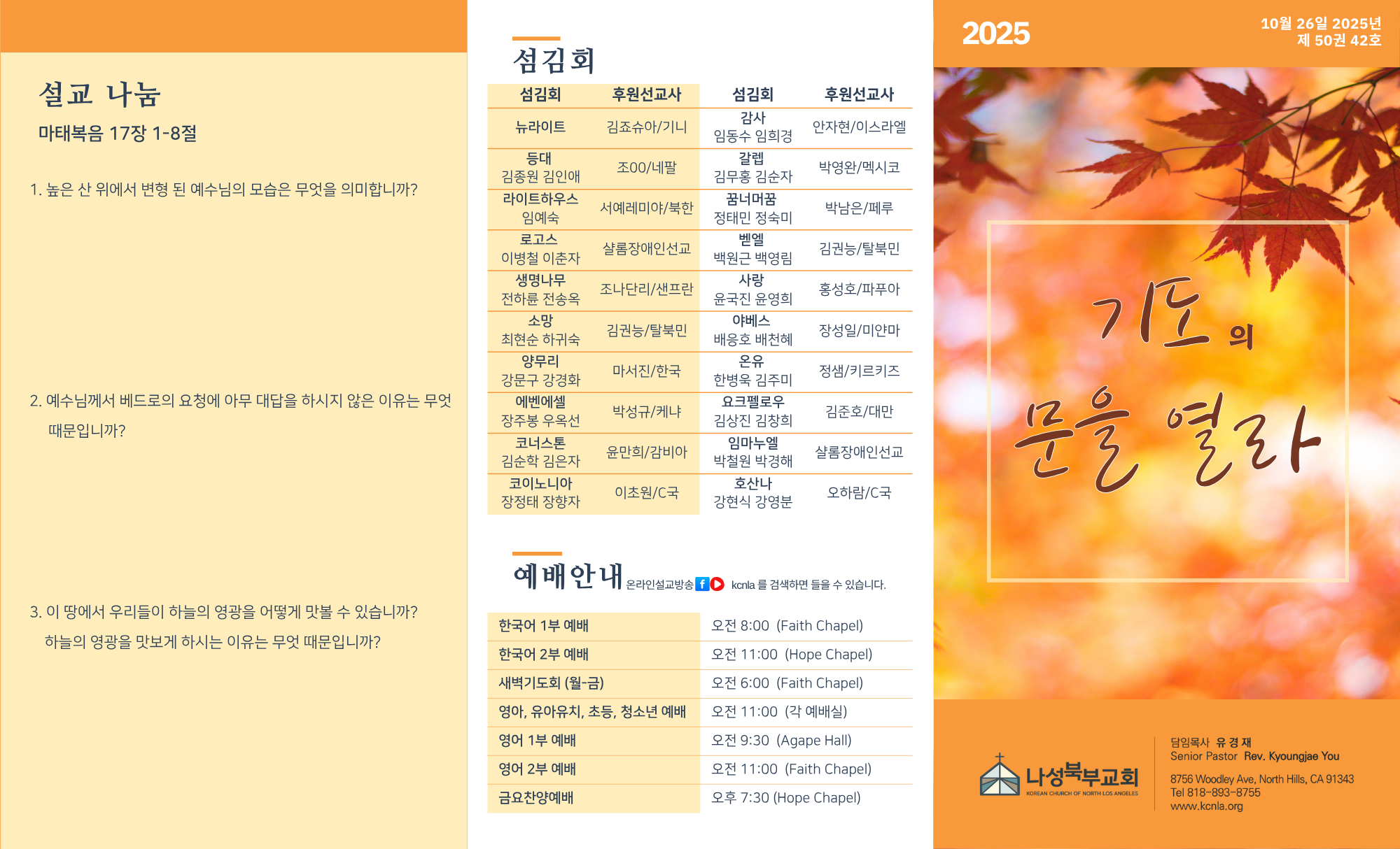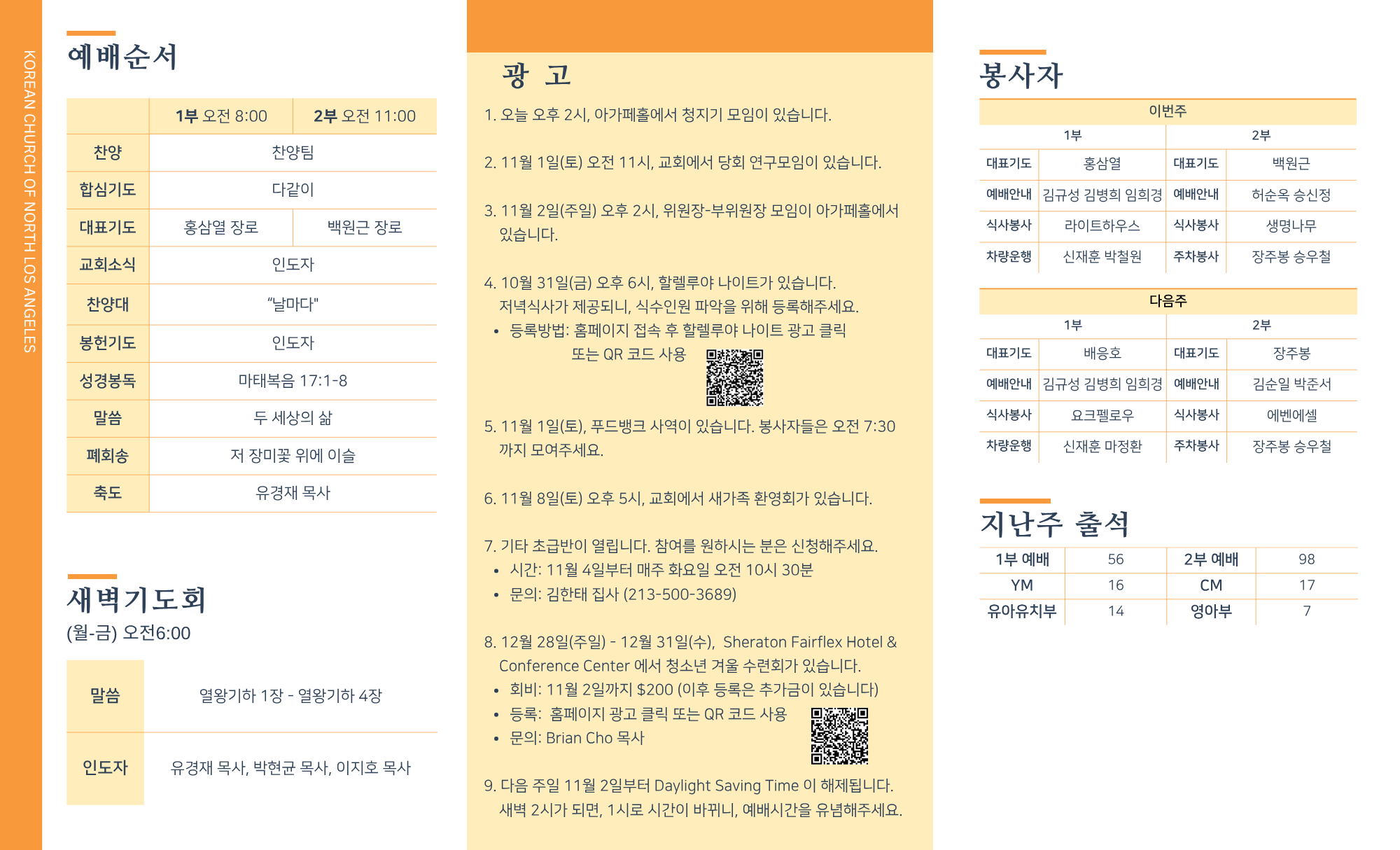 10월 26일 교회주보 페이지 정보 작성자 나성북부교회 댓글 0건 조회 453회 작성일 25-10-25 09:48 목록 본문 10월 26일 교회주보 이전글2025년 11월 2일 교회주보 25.11.01 다음글2025년 10월 19일 교회주보 25.10.18 목록 댓글 0 댓글목록 등록된 댓글이 없습니다.