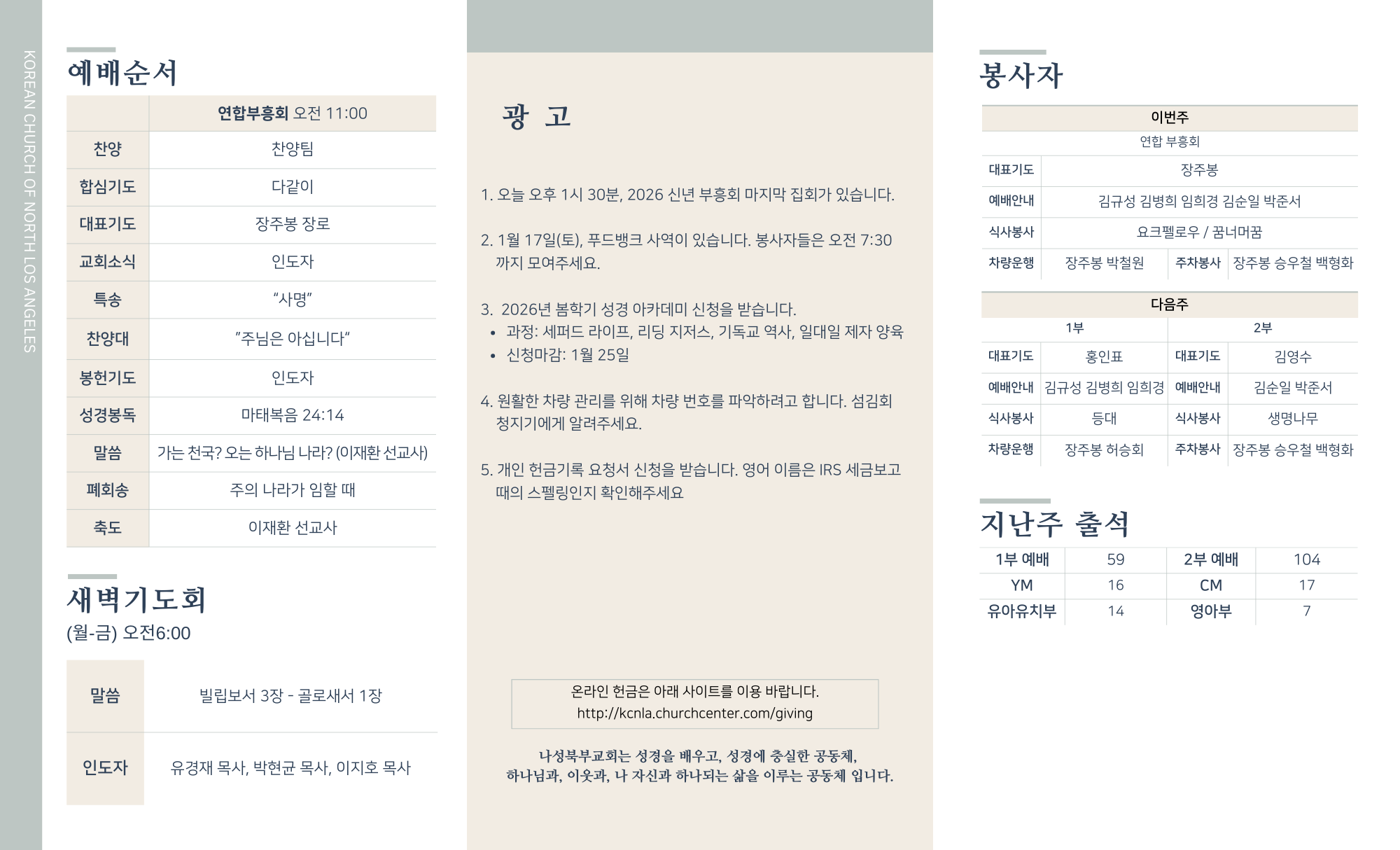 2026년 1월 11일 교회주보 페이지 정보 작성자 나성북부교회 댓글 0건 조회 48회 작성일 26-01-10 13:17 목록 본문 2026년 1월 11일 교회주보 다음글2026년 1월 4일 교회주보 26.01.03 목록 댓글 0 댓글목록 등록된 댓글이 없습니다.