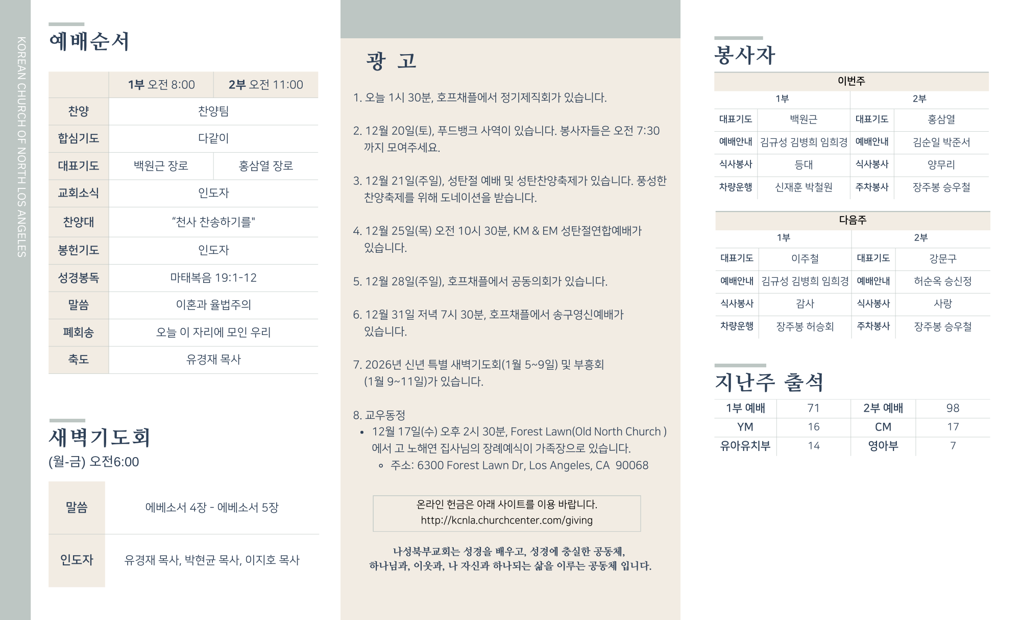 2025년 12월 14일 교회주보 페이지 정보 작성자 나성북부교회 댓글 0건 조회 57회 작성일 25-12-13 10:17 목록 본문 2025년 12월 14일 교회주보 다음글2025년 12월 7일 교회주보 25.12.06 목록 댓글 0 댓글목록 등록된 댓글이 없습니다.
