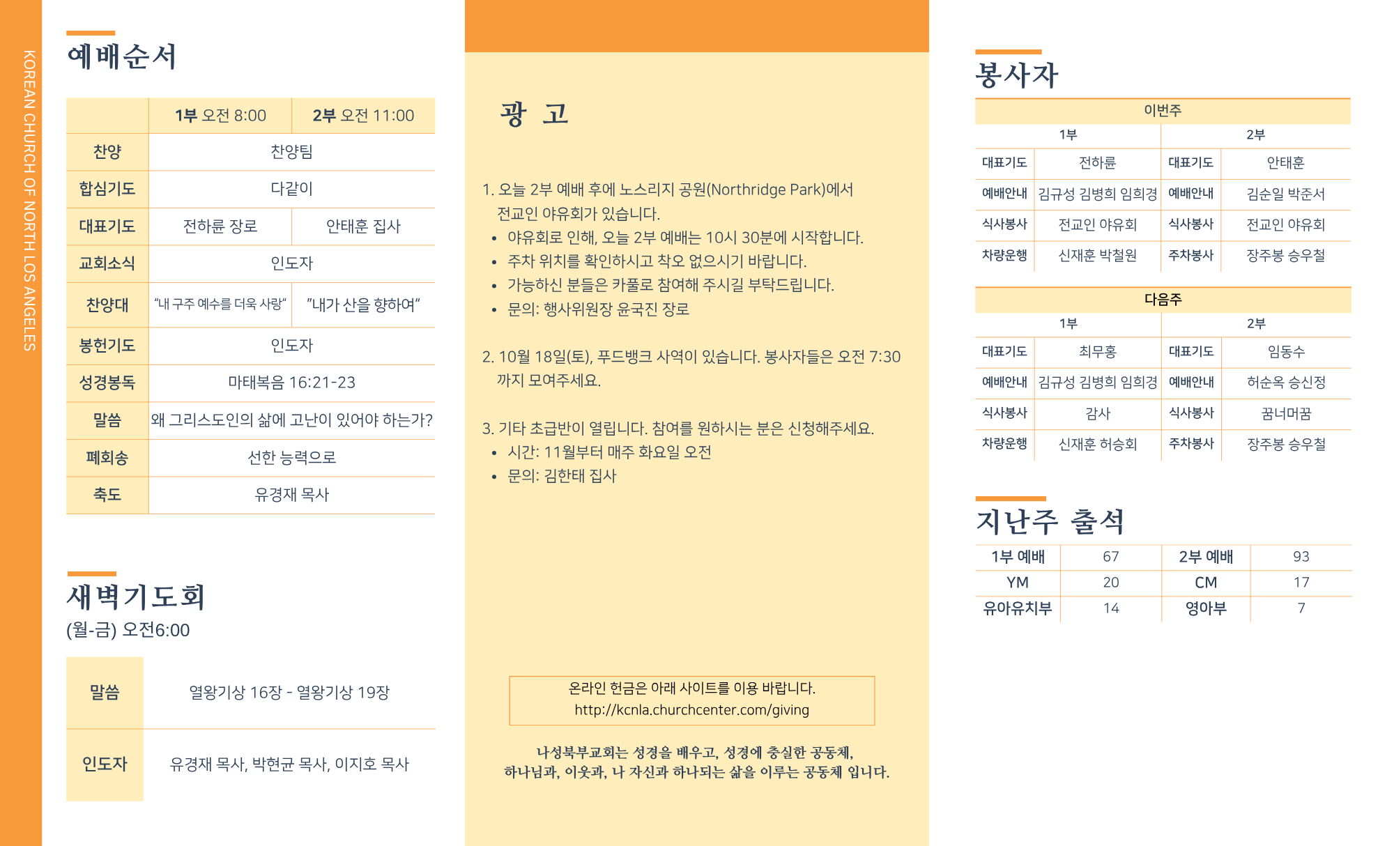 2025년 10월 12일 교회주보 페이지 정보 작성자 나성북부교회 댓글 0건 조회 278회 작성일 25-10-11 12:47 목록 본문 2025년 10월 12일 교회주보 이전글2025년 10월 19일 교회주보 25.10.18 다음글2025년 10월 5일 교회주보 25.10.04 목록 댓글 0 댓글목록 등록된 댓글이 없습니다.