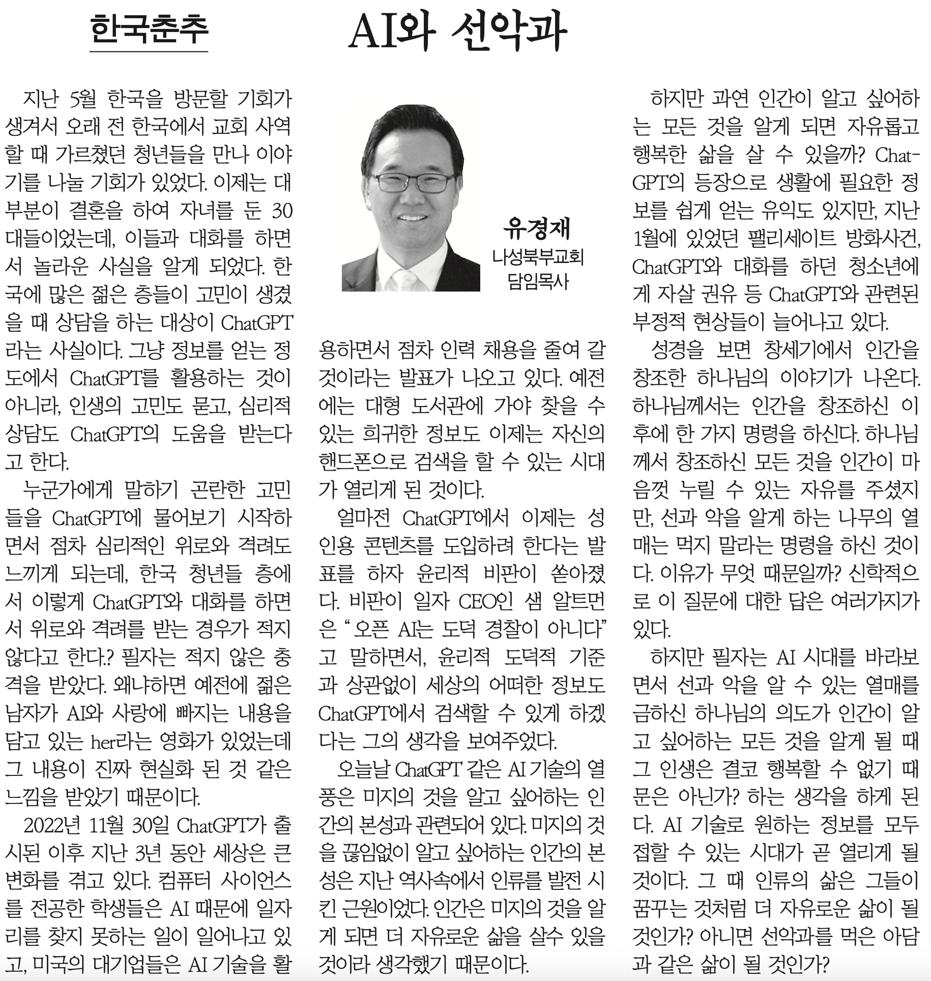 AI와 선악과 (미주한국일보 10월 31일 칼럼) Publish on November 05,2025 | 나성북부교회 페이지 정보 작성자 나성북부교회 댓글 0건 조회 157회 작성일 25-11-05 09:11 목록 본문 AI와 선악과 (미주한국일보 10월 31일 칼럼) 이전글감사의 힘 (미주한국일보 11월 28일 칼럼) 25.12.02 다음글편안함의 습격 (미주한국일보 2025년 10월 3일 칼럼) 25.10.07 댓글 0 댓글목록 등록된 댓글이 없습니다. 목록